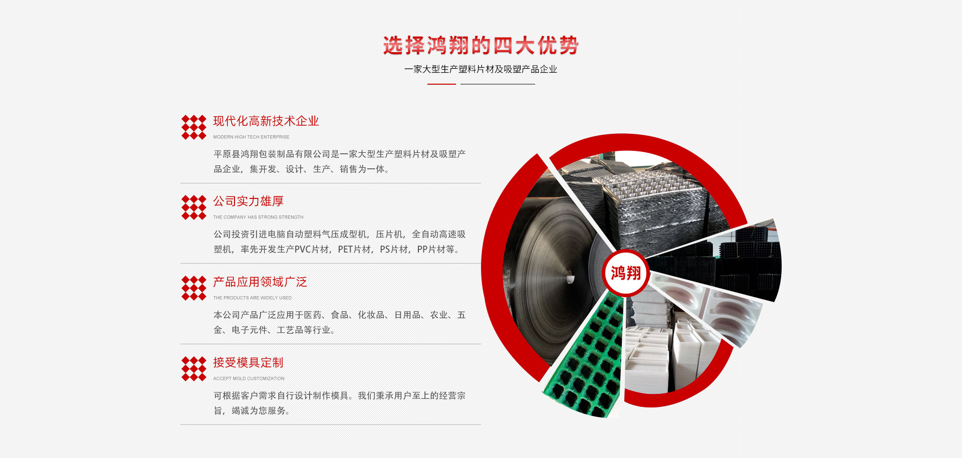 平原縣鴻翔包裝制品有限公司是一家大型生產塑料片材及吸塑產品企業,本公司投資引進電腦自動塑料氣壓成型機,壓片機,全自動高速吸塑機,率先開發(fā)生產PVC片材,PET片材,PS片材,PP片材等,鴻翔是國內先進的生產廠家之一。本公司產品廣泛應用于醫藥、食品、化妝品、日用品、農業、五金、電子元件、工藝品等行業,也可根據客戶需求自行設計制作模具。本公司技術力量雄厚,生產設備工藝先進。我們秉承用戶至上的經營宗旨,竭誠為您服務。